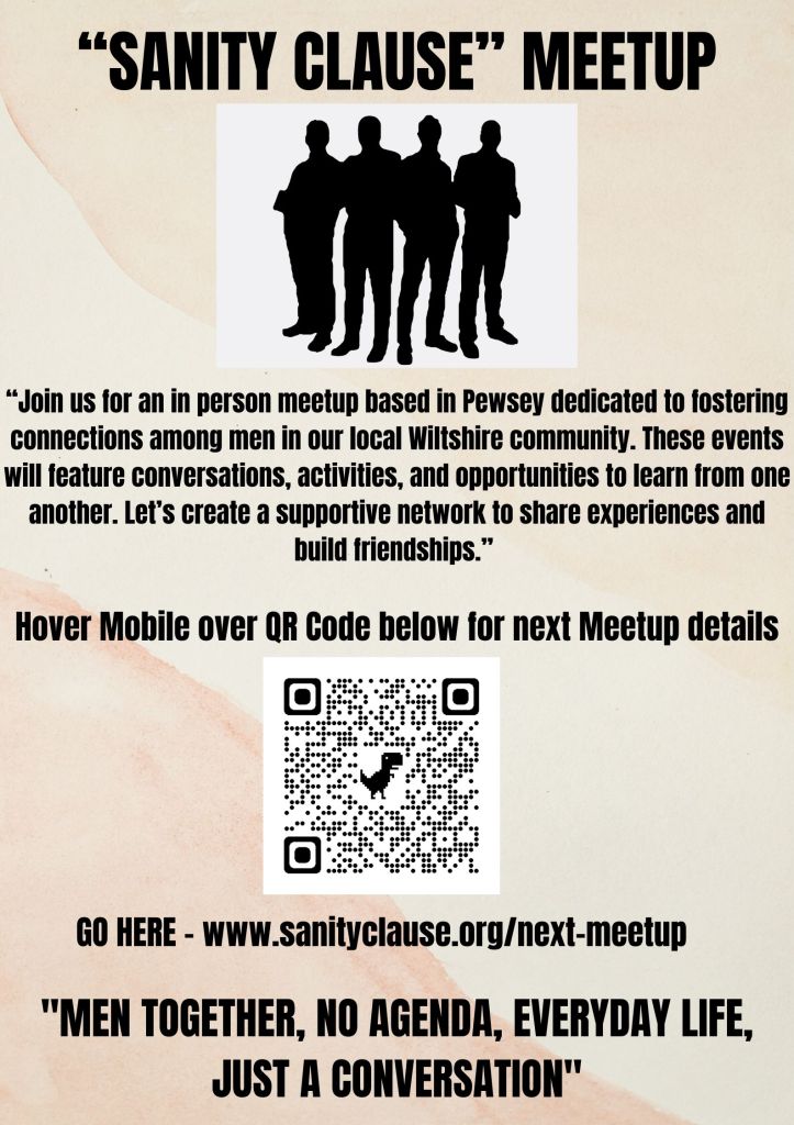 The first two monthly “Sanity Clause” Mens get-togethers took place in October and November 2024. A diverse group of twenty men attended the two meetups, which for a couple of hours featured animated chats shared in a relaxed setting over coffee/tea and Jammy Dodgers. The next will occur on Monday, December 2nd, at 6.30 pm at the Scout Hut in Pewsey Wiltshire UK.