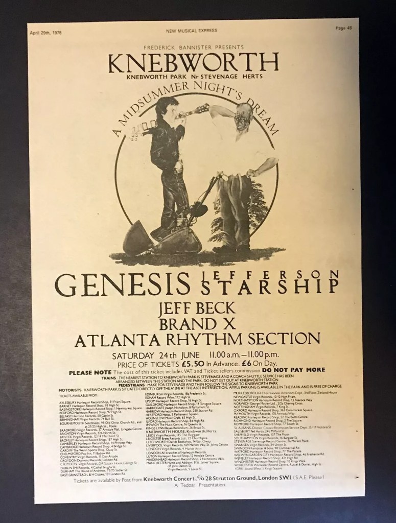 The late 70s Knebworths were the most laid back … wine and picnic, sunny days in a not too crowded field, listening to Genesis, Elkie Brooks, Santana, Tom Petty and the Heartbreakers, Jefferson Starship, Roy Harper, Lindisfarne.
